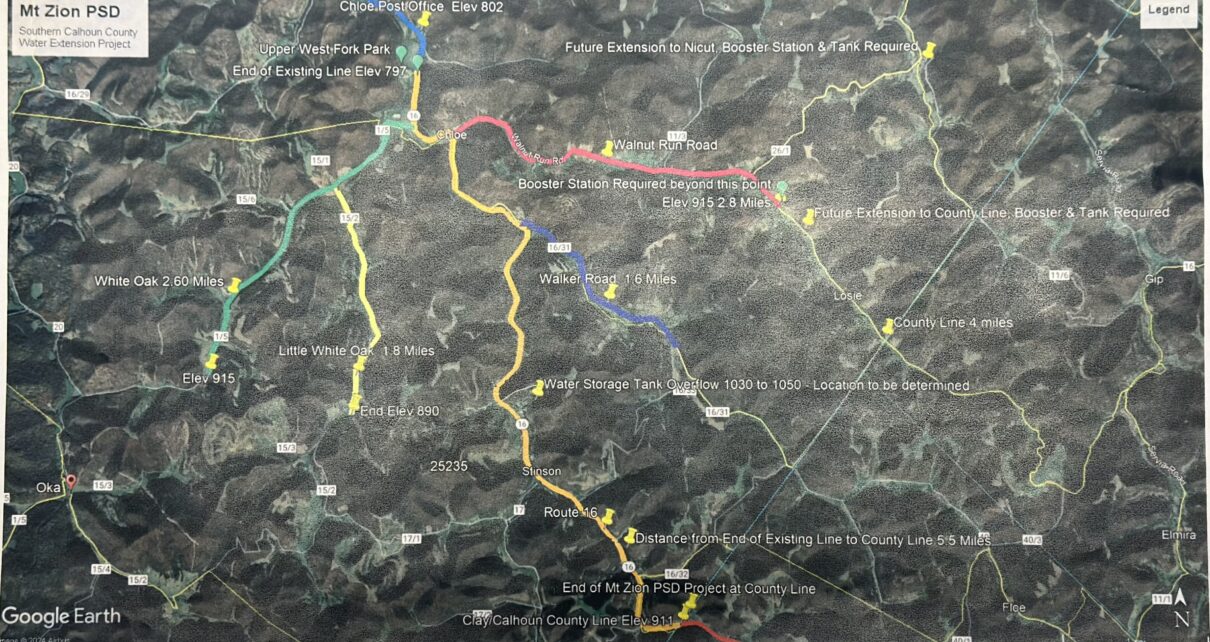Above map shows projected extension locations for water service. The Mt. Zion Public Service District hosted a town hall meeting at the Upper West Fork Park on Saturday, April 27th, 2024 to allow the pubic to weigh in on the possibility of an extension of the water line from the current ending location of Chloe Read More…