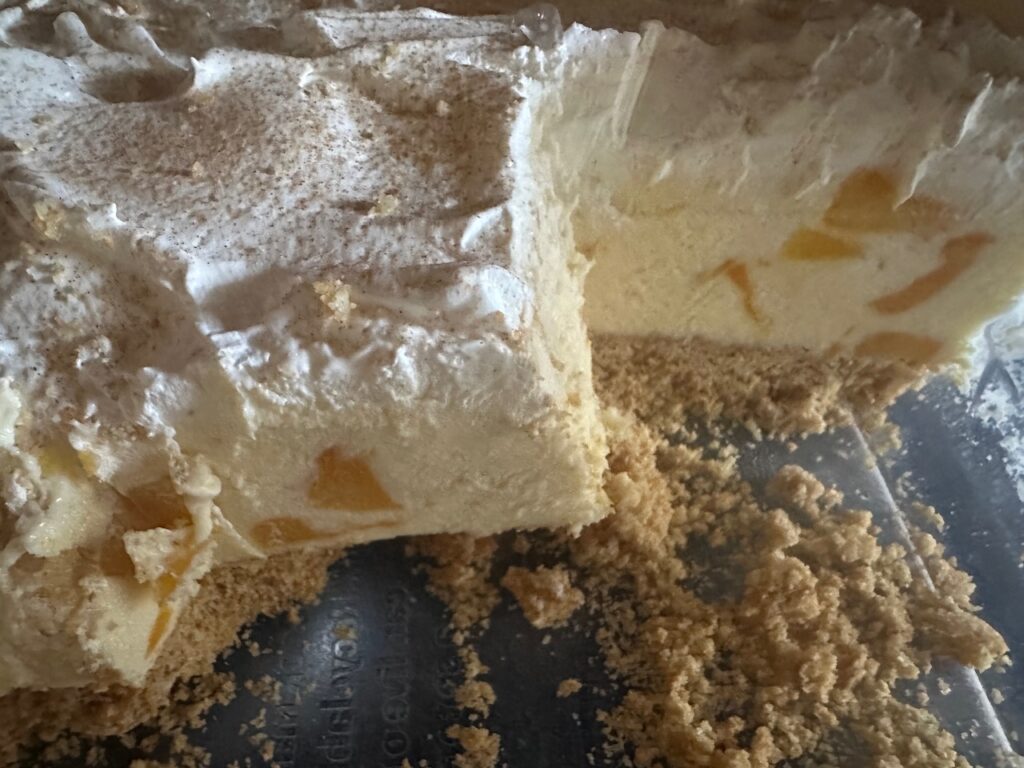 This weekend I determined to ramp it up a smidge with peach pie filling! I made my own graham cracker crust using two sleeves of graham crackers, crumbed very fine, 1/2 cup sugar and 1 stick of butter melted and pressed into the bottom of a 9×13 pan. I actually used a plastic container with lid for easy storage. I then mixed two cans of peach pie filling, 2 cans of sweetened condensed milk and 1 tub of cool whip. I put it in the freezer for about an hour and then topped it with another cool whip tub. To ad a snippet of flavor I mixed cinnamon and sugar together and sprinkled across the top. Oh so amazingly good and on these super hot days we’ve been having, it hits the sweet spot perfect!