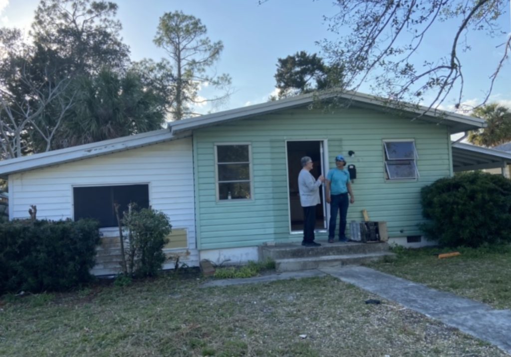 After entering the old neighborhood and spotting the familiar looking house midway through the cul-de-sac, we parked at street side. On the front lawn lay piles of debris. Approaching the open front door, we heard sounds of hammering and power sawing coming from inside. A man with hammer in hand stepped into view to greet us and inquire if he could help us. Steve explained that his mother had owned his new house many years ago and they immediately struck up a conversation.
