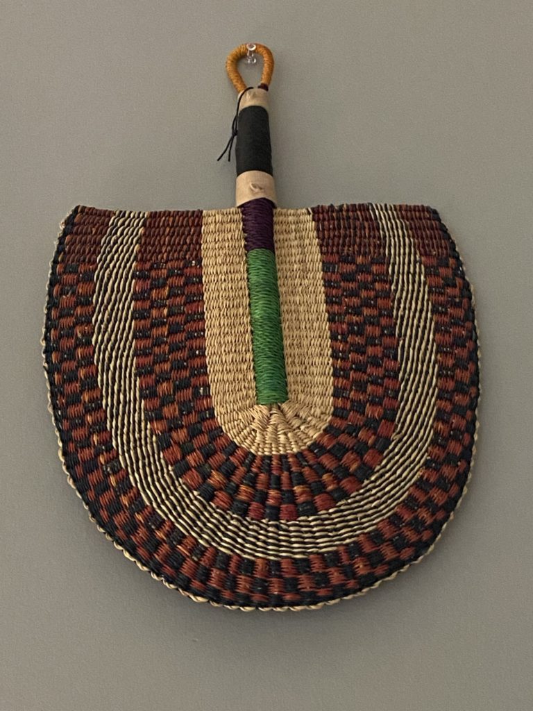 Then came the basket house. Richly colored baskets handmade in Africa. I chose one that served nicely to encase all the other treasured items we had purchased, with a handle that fit Steve’s hand perfectly as we continued with our strolling! Also, beautiful fans of amazing rich colors. This little gem caught my eye.