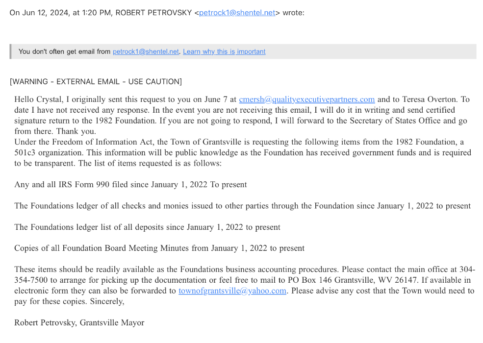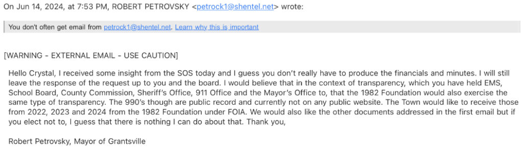 Printed below are two email correspondences sent from Mayor Robert Petrovsky regarding the Freedom of information Act, to Crystal Mersh, CEO of The 1982 Foundation, and one response from Crystal Mersh.