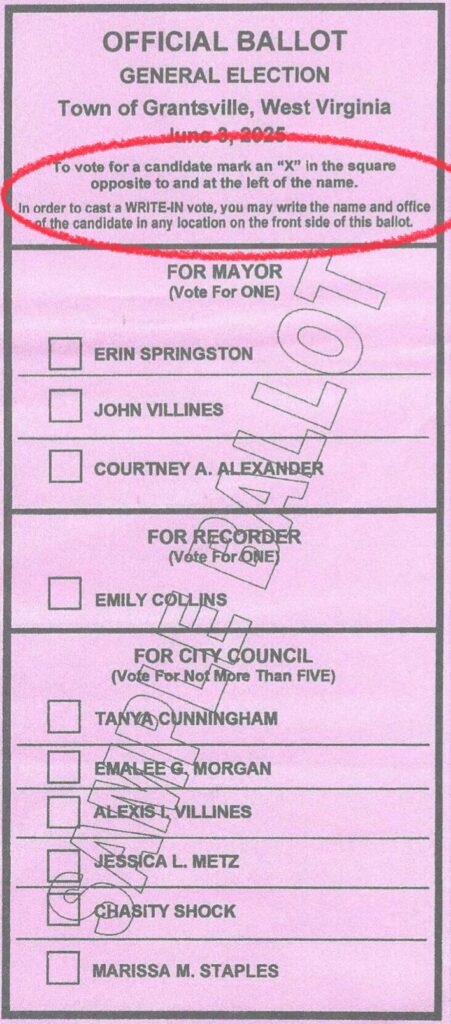 Upon contacting Casto and Harris Printing, who printed the ballots, their staff said that unless there was more than one person to vote for – and not enough candidates listed, there would not be a write-in line on the ballot. However, at the top of the ballot it clearly instructs that, should you desire to write in a candidate, that candidate’s name should be written in the appropriate location on the front of the ballot.