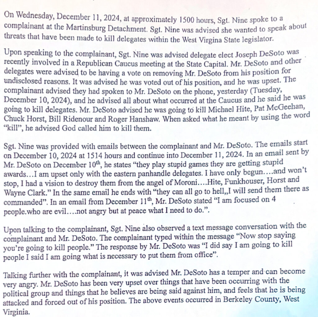 Delegate elect Joseph de Soto was arrested after having allegedly made the threats when informed he might be dropped from his GOP caucus position. De Soto, a medical doctor from Gerrardstown which is approximately 100 miles west of Washington, D.C., had been informed of a vote removing him from his position for “undisclosed reasons.” It had been reported that he was being probed for misrepresenting his medical and military information while running for office. This subjected him to a vote of expulsion from the GOP caucus.
