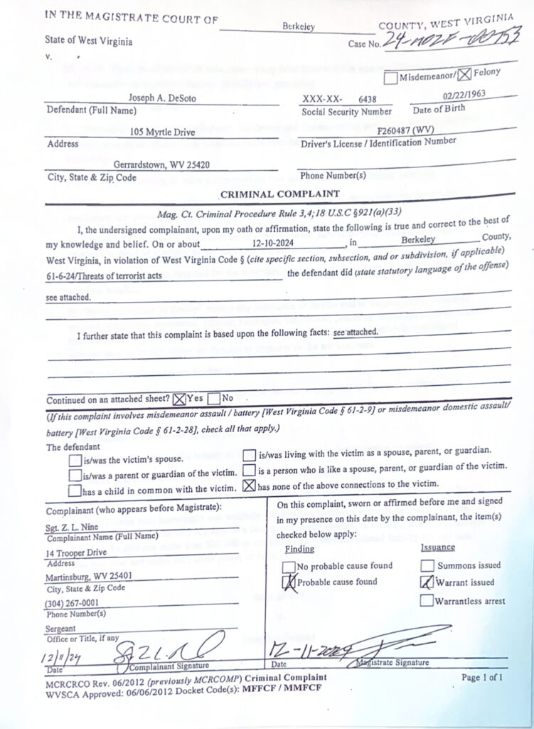 Below is the criminal complaint filed in the Berkeley County Magistrate Court by Sgt. Z.L. Nine of the West Virginia State Police.