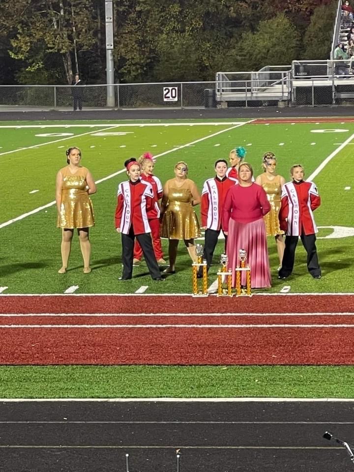 The Calhoun Middle High School Marching band competed at the 68th Annual Black Walnut festival Band and Majorette Competition last Saturday 10-15-22. There were 6 bands in the category making Class C the largest category. Trophies were awarded to bands that scored 1st , 2nd , or 3rd In the categories of Percussion, Silks (colorguard), Field Commander, and Overall band in class.