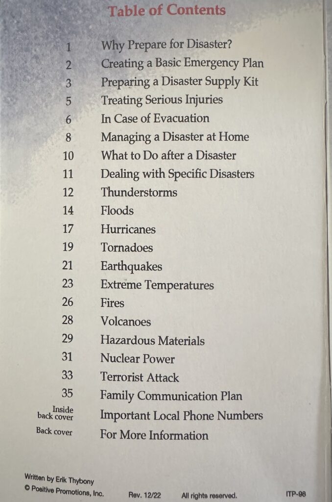 The 38 page booklet is filled with information necessary for every family when facing a local disaster on how to plan, what to have on hand, what to do before, during and after specific sistuations and contact numbers for quick reference. The group determined to look into the cost of printing and have a supply on hand at county events such as the festivals.