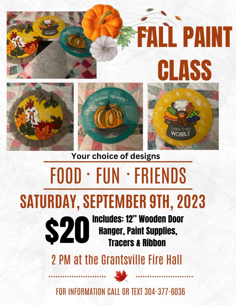 Shari Johnson will be hosting a fall paint party on Saturday, September 9th, 2023 at the Grantsville Volunteer Fire Department. Those who are registered will receive all supplies to make a wood door hanger, including paint, materials and tracers for one of the three designs available. The two hour class will provide instruction, afternoon snacks with tea and coffee. Must pre-register. No experience necessary.