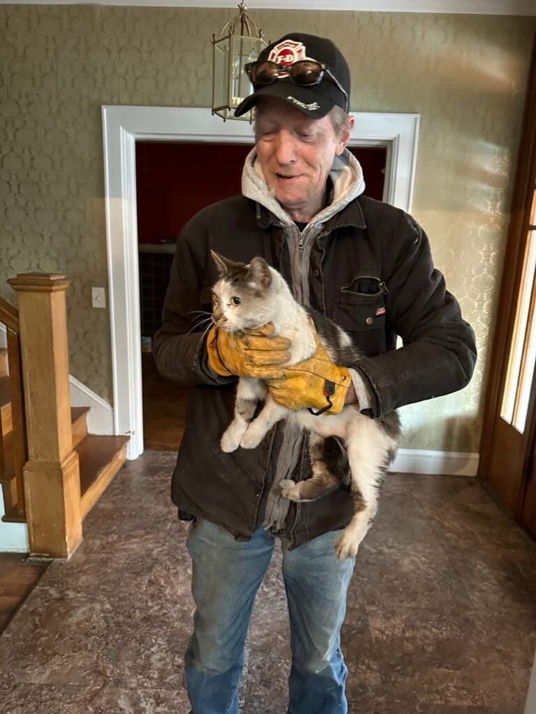 A three day saga of a trapped feline began Monday evening when Fire Chief David Johnson received a call from Calhoun Control that a cat on High Street in Grantsville had climbed inside a chimney in the home of Thomas McVey, a traveling nurse, and couldn’t be coached out. For three days, at various times Johnson , Craig Gherke, Kayla Morford, and Jon Fleagle searched for the cat without success of getting it out. At times there was no sound of the cat and concern for its health, or that it had possibly escaped without notice was in the mind of the fire fighters.
