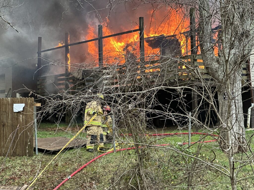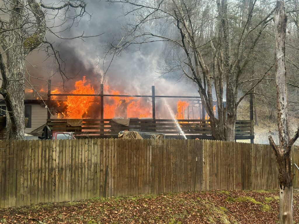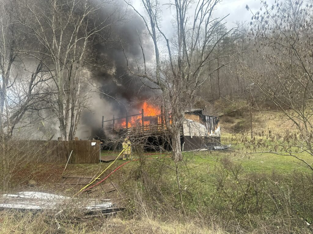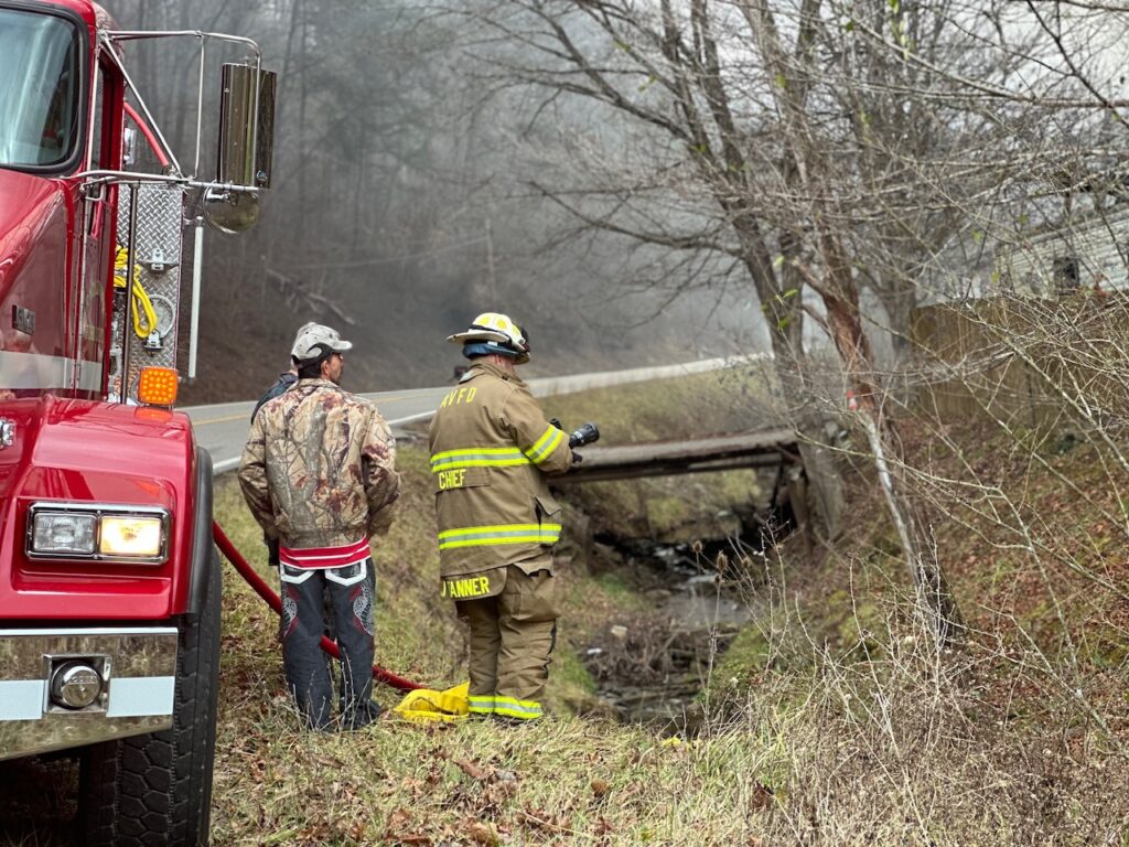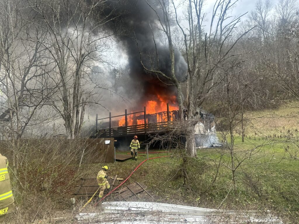 Tony McCune and Melissa West were still in bed when they awoke to discover their house was on fire around 1:30 p.m. January 4, 2024. The modular home was quickly and fully engulfed by the time that Arnoldsburg Volunteer Fire Department was on scene. The McCune was located just west of Liberty on 33/119. With the structure being across the creek fire crews had to maneuver up and down the steep creek banks and string fire hose across the creek to be able to fight the fire.