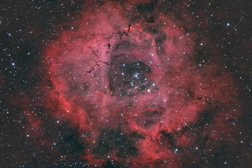 Shot last week at Calhoun County Park during the Star Party.The Rosette Nebula is a vast emission nebula located about 5,200 light years away. The star forming region lies near a large molecular cloud in the constellation Monoceros, the Unicorn. It is closely associated with the young open star cluster NGC 2244. Also known as the Satellite Cluster, NGC 2244 appears in the centre of the Rosette. The hot young stars of the cluster were formed from the nebula’s material in the last 5 million years.