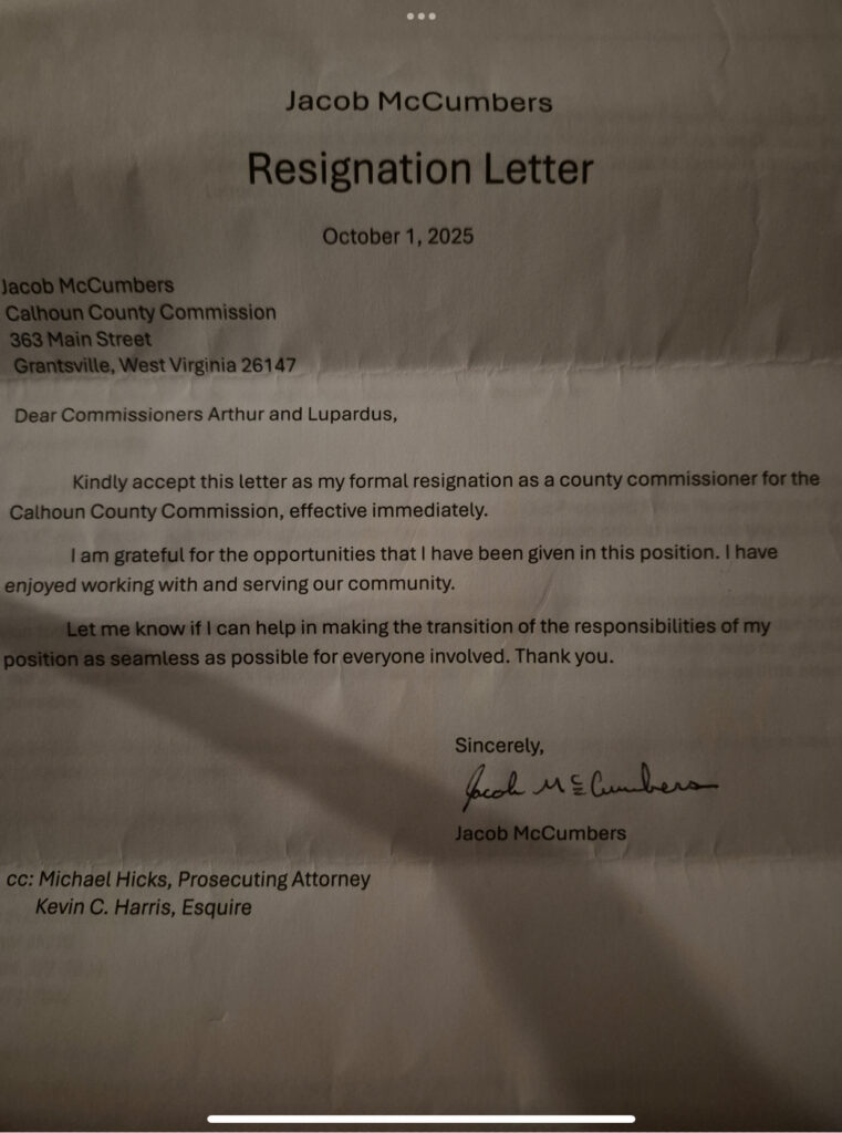 Commissioner Jacob McCumbers tended a letter of resignation (above) to the Calhoun County Commission resigning his position as Calhoun County Commissioner effective immediately.