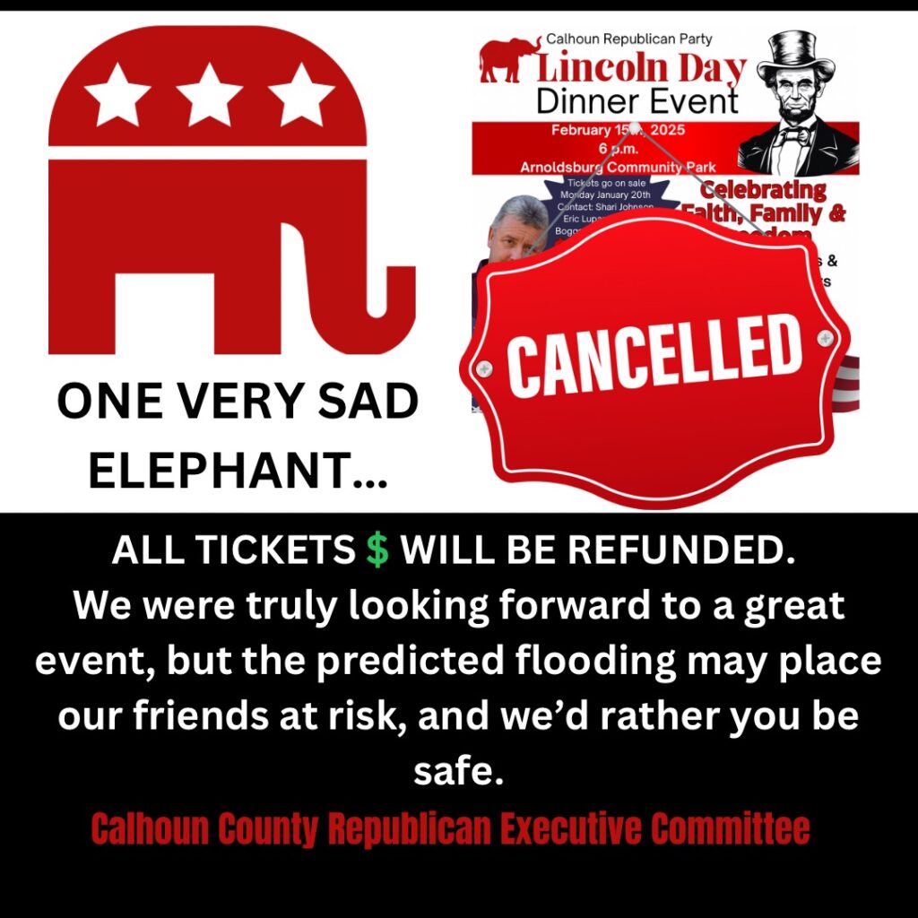 Due to the predicted rains, the Calhoun Republican Executive Committee made the tough decision to cancel their Annual Lincoln Day Dinner.