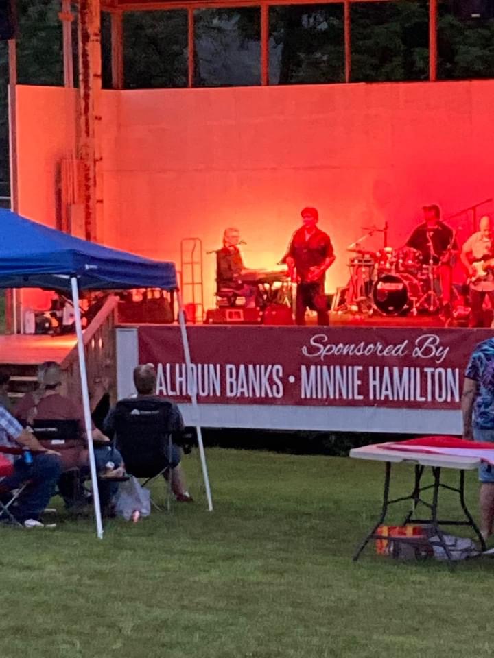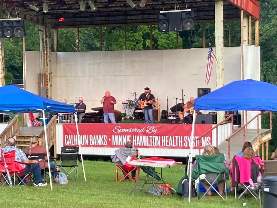 Friday Night was certainly not the ideal weather, but it didn’t deter the fans from showing up at Calhoun County Park for the Ronnie McDowell concert event co sponsored by Minnie Hamilton Health Systems and Calhoun Banks. Around 150 people came with canopies and and umbrellas prepared for the weather and a good time.