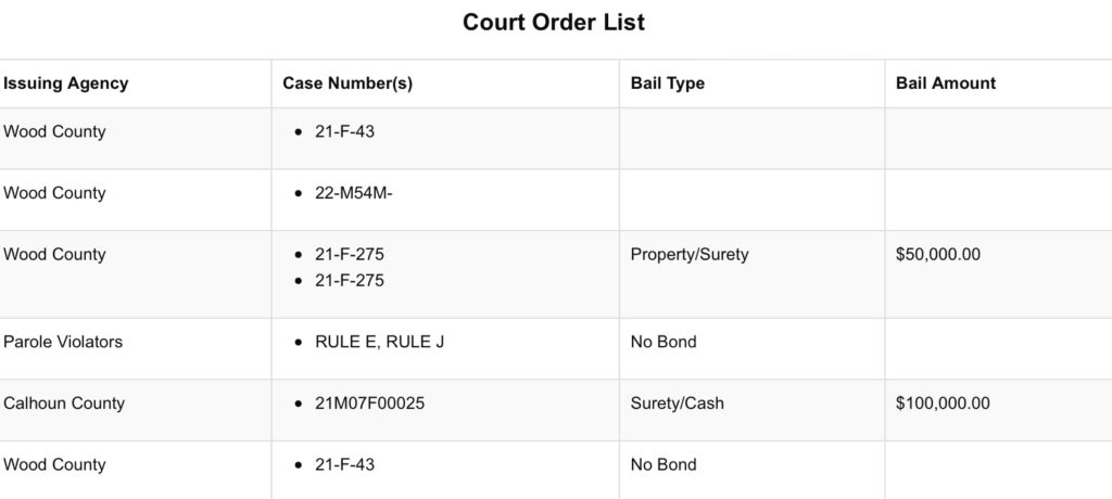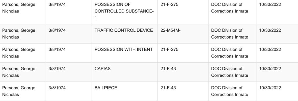 George Nicholas Parsons was arrested on a misdemeanor out of Wood County which likely triggered a parole hold for a prior conviction out of Wood County as well. The regional Jail website also shows a hold for Calhoun County, although he has yet to be arrested by Calhoun authorities. According to Prosecuting Attorney Nigel Jeffries, the court is currently waiting on additional information before taking action.